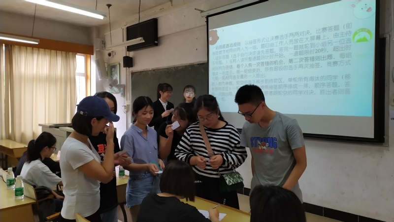 初赛结束之后,正式进入此次比赛的"一站到底"阶段,选手以抽签的形式组队直接两两对决,工作人员将题目放到屏幕上由主持人组织答题,限时20秒超出时间视为答错两次答错直接出局,经过激烈的角逐,气氛越发紧张,谁能沉着冷静谁就会脱颖而出取得理想的名次,在这场知识、策略与速度的竞争中有六名同学获得优异的成绩,一等奖获得者刘俊涛,二等奖王雪晶,三等奖周玉萍,还有田文慧、廖雨欣、钟德凤三位同学获得优秀奖,他们的精彩表现获得观众的欢呼与赞许。