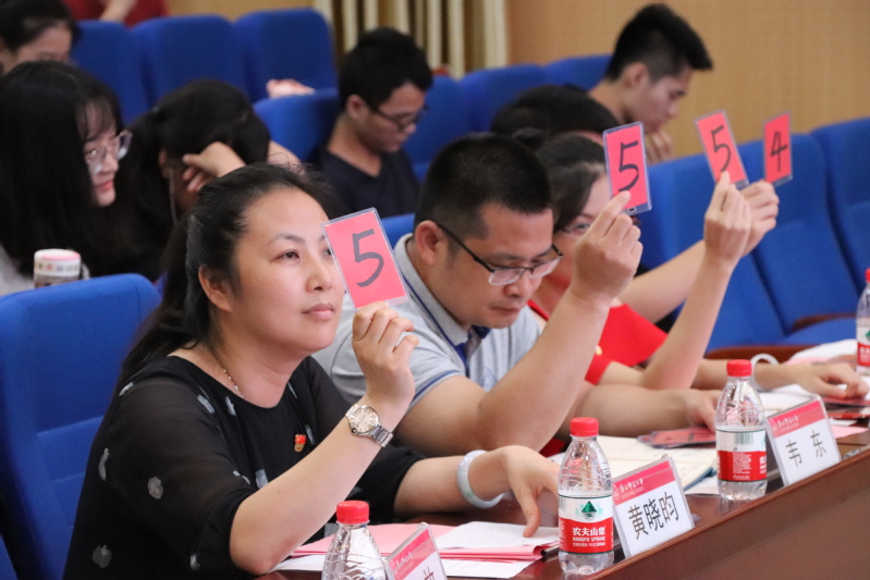比赛结束由党委副书记对此次比赛进行点评,党委副书记提到在身临其境环节选手们的配音情感拿捏到位,这种观看影片的学习方式值得赞扬,比赛题目有难度也有深度,不仅有改革开放的新政策还有教育大会的精神,环节设计新颖,材料贴合实际,比赛氛围好,引起台下的观众的共鸣,做到人人思考和参与。
