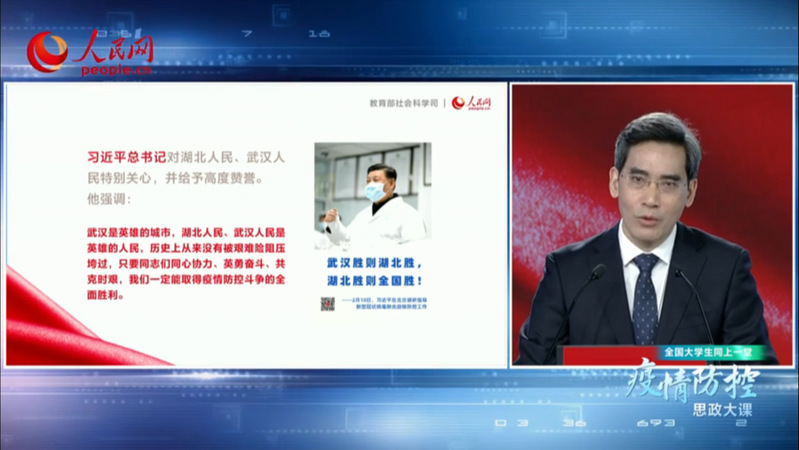 一个半小时的大课,艾四林、秦宣、王炳林、冯秀军四位老师结合四门必修思政课程《思想道德修养与法律基础》《中国近现代史纲要》《马克思主义基本原理概论》《毛泽东思想和中国特色社会主义理论体系概论》,介绍了中央政治局常务委员会召开的相关会议,解读党中央有关疫情防控的决策部署。课程讲授中,四位老师分享了在一线战疫的基层人员和医护人员的感人事迹,号召广大学生学习战疫人员团结一致、舍己为人、甘于奉献的精神。此外,几位老师还从必修思政课出发,阐明中国特色社会主义最本质的特征是中国共产党的领导,以及中国特色社会主义制度的优越性。提出青年学生要增强“四个意识”、坚定“四个自信”、做到“两个维护”,坚定信心和决心,在以习近平同志为核心的党中央坚强领导下疫情防控必将取得胜利。