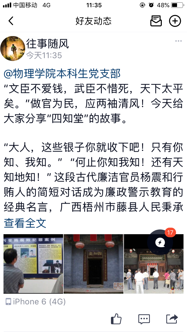 2020年,是不平凡的一年,突如其来的疫情牵动着每一个人的心。在推进疫情防控与风险防控相结合的情况下,学院本科生党支部以一种特别的方式开展此次廉洁活动。支部成员们通过挖掘学习家乡周边的廉政教育基地、回顾古往今来廉政官的先进事例,品读经典的廉词廉句,将自己的学习心得写成日志的形式发表在QQ空间等新媒体平台,在自我廉洁意识提升的同时又将家乡的廉政文化带给了更多的人。其中刘海威同志在品读廉句“淡如秋菊无妨瘦,清似莲花不染尘。”时提到,身为共产党员就应该淡入菊花,清似荷花,不忘初心,坚守使命,砥砺前行;何慧融同志通过对家乡廉政基地内文化的学习,发出要将浩然正气吹遍社会每一角落的号召;秦彩营同志在对廉政英雄王力的学习中,表示从王力的身上体会到很多高尚的品格,值得我们学习。支部每位成员都能积极踊跃地参与其中,并纷纷表示要自觉遵守廉洁自律准则,牢固廉洁意识。