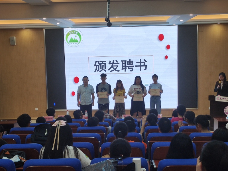 大会伊始,是新老会长交接会旗仪式,会旗是一个社团荣誉的代表和传承,会旗交接仪式伴随着轻音乐进行着。社团取得成绩离不开各会干的努力,聘书颁发仪式代表学院对他们过去一年工作的认可,韦东老师和张放老师上台为上任会干颁发聘书并合影留念。各协会新任会长依次上台做就职演讲,在他们充满斗志的演说里,流露出他们对未来管理好协会的期待。随后,各协会新任会干宣誓尽职尽责做好社团活动。
