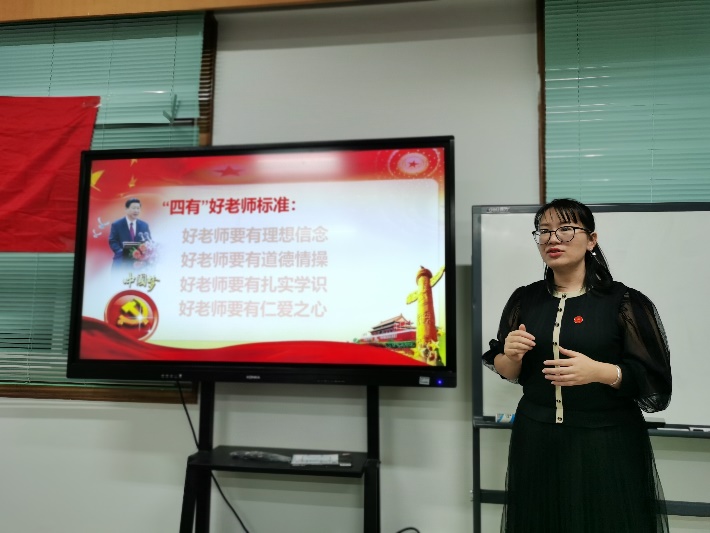随后,梁巧犁同志根据自身经历,围绕“争做四有好老师”分享了自身对于坚守育人初心的理解。她从理想信念、道德情操、扎实学识、仁爱之心四个方面展开,讲述了她关心、鼓励和爱护学生、并不断提升自我的生动事例,为未来从事教师职业的同志们传授了宝贵的经验。