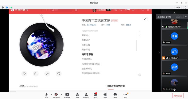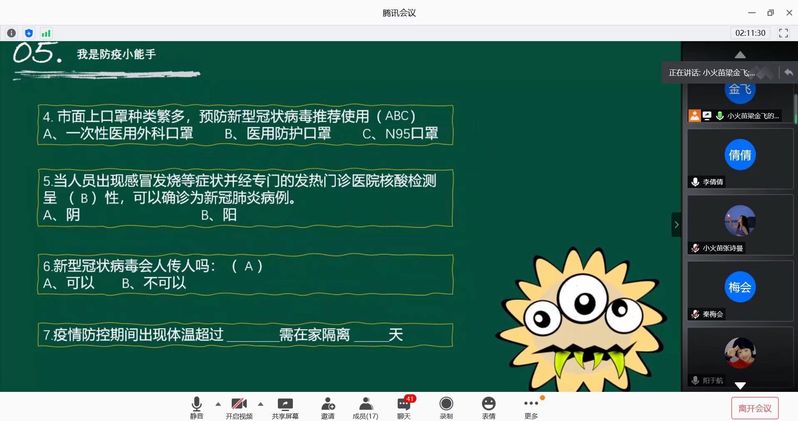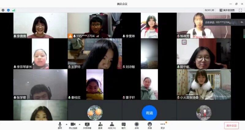 志愿者们通过腾讯会议开展本次活动,志愿者们热情地与各位家长和小朋友打招呼。首先是介绍参与人员,由广西师范大学青年志愿者协会必一·运动(B-Sports)官方网站与技术学院分会云峰支教团队8人和灵川县潮田乡中心校共18名学生分别进行自我介绍,志愿者们播放《青年志愿者之歌》和动画片主题曲来活跃气氛,并了解到同学们大致的爱好,此外,各位志愿者还与孩子们一起玩游戏, “线上数字签到”、 “谁是雅士”、 “你画我猜”、 “我是防疫小能手” 等游戏拉进了大家的距离。第一个游戏是“线上数字签到”,由主持人在聊天框内输入数字“1”开始,参与人员按顺序输入1至50的数列,若多人重复输出同一数字或同一人连续输出两个数字则要接收输出数字最多的玩家的惩罚,游戏考验参与者的反应能力和协作能力。第二个游戏是“自我介绍”,参与人员分为两组,同时转动两边刻有参与者姓名的罗盘,有主持人操作罗盘转动与停止,罗盘停止时,其上的指针对面的两人要相互自我介绍,除了姓名等基本信息外,参与者们纷纷介绍自己的兴趣爱好,并找到了与自己有共同爱好的好友。第三个游戏是“谁是雅士”,通过15道有趣的古代知识选择题来考察学生对古代文化知识的积累程度,通过积分制调动参与者的积极性,夺得榜首的同学获得“文人雅士”的奖状。第四个游戏是“你画我猜”,参与者加入“你画我猜”小游戏程序,培养了参与者之间的默契,激发参与者的想象力的创造力。第五个游戏是“我是防疫小能手”,通过14道有关抗疫防疫的题目和一道关于“洗手七步法”的附加题来强化疫情防控的观念,学习预防方法,也是采取积分制,得分最高的同学获得“防疫小能手”的奖状。第六个活动是“最想做的事”,在活动的七天内利用现有物品将心中最想做的事变成词语排列出来,然后将排好的文字拍照发在群里,锻炼了参与者的动手能力。最后全体人员纷纷说出或是写下对小火苗暖冬支教和未来的寄语。
