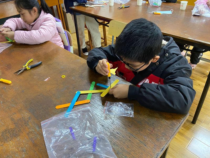 材料发下来以后,同学们都迫不及待得做了起来,这一次的制作较之前几次都更快,制作完成后,助教老师也简单科普了伸缩夹夹杯子有摩擦力的因素。有小朋友很快反应过来,越光滑的东西越不好夹起来。