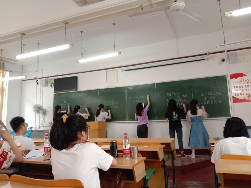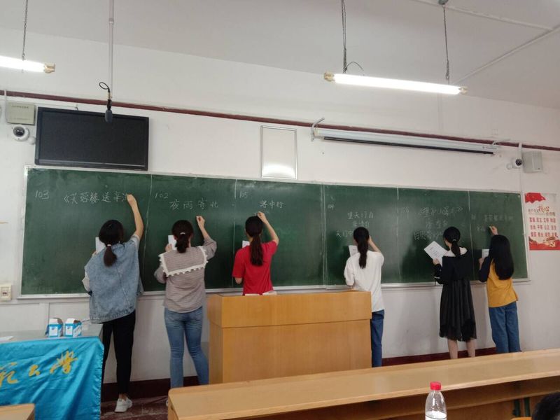 此次活动面向物理学院的全体同学,活动前期,负责人组建活动QQ群,并在群内发布活动任务以及注意事项,呼吁同学们积极参加粉笔字比赛,参加的同学在到梦空间APP上报名活动后进入相关QQ群填写报名链接,此次活动以用粉笔书写有关历史文化和人物的古文诗词的形式开展,不仅能让参赛者在书写的过程中了解相关历史知识,也让与赛者在古诗中的人物上学习到美好的品质和精神。在比赛现场上,参赛者认真答题,尽力展示自己的最高水平。答题结束后,同学们虚心接受了评委的点评与指正。