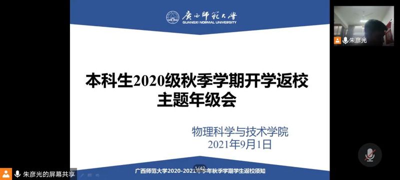 会议上,辅导员首先提出9月4日、9月5日学生(含本、硕、博)分批错峰返校报到注册,9月6日起正式上课。学生一律不准提前返校。国际学生暂不返校。学生居住地为中高风险地区的,须按居住地要求实行健康管理,风险等级降为低风险后经学校批准可有序返校;学生被确定为密切接触者或次级密切接触者的,须按居住地要求实行健康管理,后经学校批准可有序返校;学生或家庭成员有境外旅居史的,须按入境地要求实行健康管理,后经学校批准可有序返校;开学前14天内学生内有发热、咳嗽、呼吸困难等身体不适症状的须第一时间告知辅导员,痊愈3天以上后可持有当地健康绿码和返校前7天内核酸检测阴性结果证明返校。接着,便提出了返校前准备:一、学生每日通过“钉钉”如实上报健康信息,辅导员对所带学生返校前14天(8月20日起)健康监测信息进行核查。二、学生应于入校前5日(8月30日)做好返程规划;通过易班易班“易知独秀”的“返校登记”填报返校信息。三、学生应于9月3日前向辅导员出示个人实名健康码,持健康绿码的学生方可入校,如自驾车送学生来校报到的还需提供随行人员健康码,区内学生需通过微信扫码抗疫情小程序申请注册广西健康码,区外学生还需提供所在省、市、区认可的个人健康码。四、学生报到前应通过微信小程序“国务院客户端”—“防疫行程卡”查询14天的行程信息9月3日前,向辅导员出示查询结果持绿色行程卡的学生方可返校。五、按上级要求,高校师生员工开学前需持 48 小时内核酸检测阴性证明,途中做好个人防护措施未按要求进行健康监测或特殊情况返校学生,需提供返校前3天内核酸检测为阴性的核酸检测报告,并发给辅导员审核,审核通过后方可返校。六、根据学校统一安排,全体学生开学要完成防疫知识、文明安全考试