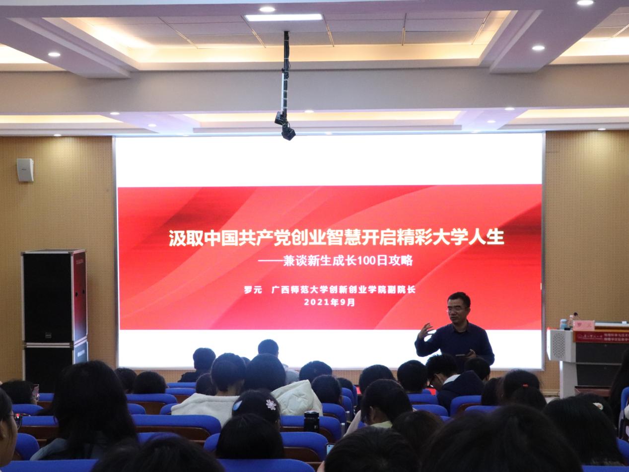 讲座以“什么是创新创业”“为什么说中国共产党是最牛的创业团队”“中国共产党创业成功的秘笈是什么”“新生成长100日攻略如何从中国共产党创业成功的智慧中汲取智慧”依次展开。首先,创新创业学院副院长从阐明创新创业的本质就是“突破资源限制,实现目标,为社会创造价值”,创业不仅仅是创办企业赚钱,更是指为人民、为国家、为人类开创基业。其次,他通过播放中国共产党筚路蓝缕奠基立业百年创业短片,引导大家对中国共产党创业的艰苦创业历程及成功的秘笈进行分析,指出中国共产党作为史上最牛的创业团队不仅仅表现在从无创业资金到GDP全球第二、从创业初始的50多人到9500万多名党员、从无创业办公地点到管辖面积世界第三、从半封建半殖民地民不聊生到14亿人民一起实现小康。中国共产党以信仰的力量重塑了中华民族的性格和“集体自尊”,中国共产党比任何政党都“站得高、看得远、爱得深”,其成功的秘笈就是心中有人民、有主义、有团队、敢创新且自我净化能力强。最后,他建议每一位21级新生要善于抓住新生入学100日难得的教育与学习机会,从中国共产党创业精神和智慧中学会“三找一懂”,即争取在新生入学100日内找到人生发展的方向、找到志同道合的团队、找到高质量发展的资源,并懂得学习和幸福生活的方法。创新创业学院副院长和学生分享了我校一批优秀师兄师姐的成功案例,告诉学生要把自己当成一个“品牌”来管理,把人生当成一家“上市公司”来经营,把大学四年当成“公司上市”前做准备。只要初心不改,自立更生,艰苦奋斗,读师大依然可圆北大清华梦。他强调找人生的方向要立足于拥抱人民、紧跟时代和专业、结合自身,通过找专家、寻榜样、广阅读等有效路径来寻找,同时要寻求构建有共同价值认可的社区、依托“互联网+”大赛、专业竞赛及慈善公益项目建立发展团队和优化整合资源。只有心中有人民,眼前有主义,胸中有格局,身边有团队,行动有资源,学业有创新,脚下有修行,才能拥有幸福的人生。