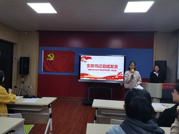 会议的最后,物理学院本科生第一党支部书记发表讲话:支部书记首先对各位新预备党员表示祝贺,强调了各位预备党员的新身份、新职责,并对各位新预备党员提出要求:加强学习党的先进理论知识,以正式党员的标准来要求自己,从思想上和行动上不断完善自己;以优秀党员为榜样,在能力上不断锤炼自己,讲党性、重品行、做表率,争取早日成为合格的共产党员。各位新预备党员应牢记自己的第一身份是党员,第一职责是为党工作,牢记书记的要求,争取为新时代的伟大建设贡献自己的力量。