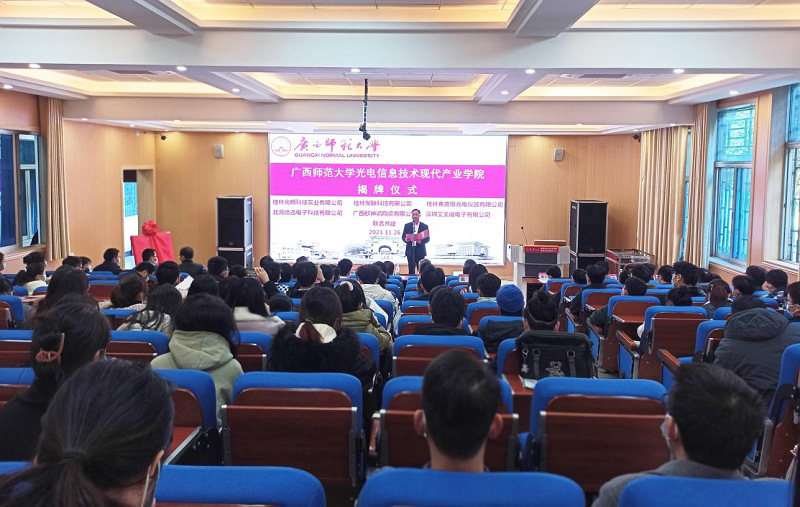 学院新闻11月26日,广西师范大学光电信息技术现代产业学院揭牌仪式在育才校区物理实验楼阶梯教室举行。校长贺祖斌,副校长林春逸,梧州市科技局调研员黄甲夫,桂林市光明科技实业有限公司、桂林聚联科技有限公司、桂林弗克斯光电仪器有限公司、北海绩迅电子科技有限公司、广西欧神诺陶瓷有限公司5家区内共建单位的代表出席活动。