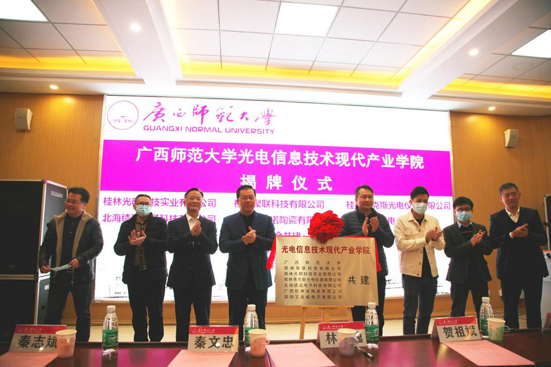 共建单位代表、桂林市光明科技实业有限公司总经理秦文忠和桂林聚联科技有限公司秦志斌书记,分别感谢广西师范大学对企业的支持。他们指出,近年来光电信息技术产业的迅速发展,国民经济和国防建设的各行各业对光电信息人才的需求逐年增多,对光电信息技术基本知识和应用技能的需求也在增加,并希望以光电信息技术现代产业学院的揭牌为契机,进一步加强与广西师范大学在人才培养、科研攻关、毕业生就业等方面的合作交流。