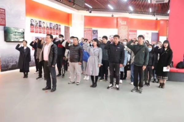 在参观学习后段,学院党委负责人带领新一批预备党员在展厅内举行庄严的入党宣誓仪式。学院党委负责人对新一批预备党员加入中国共产党表示祝贺,同时告诫学生党员要端正入党动机、坚持理论学习、坚定理想信念,不仅要在行动上入党,更要在思想上入党。