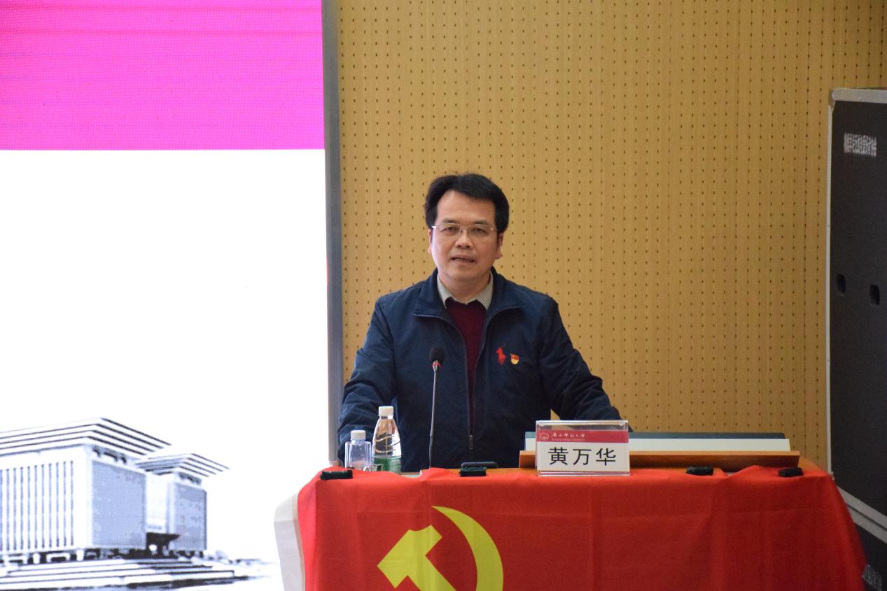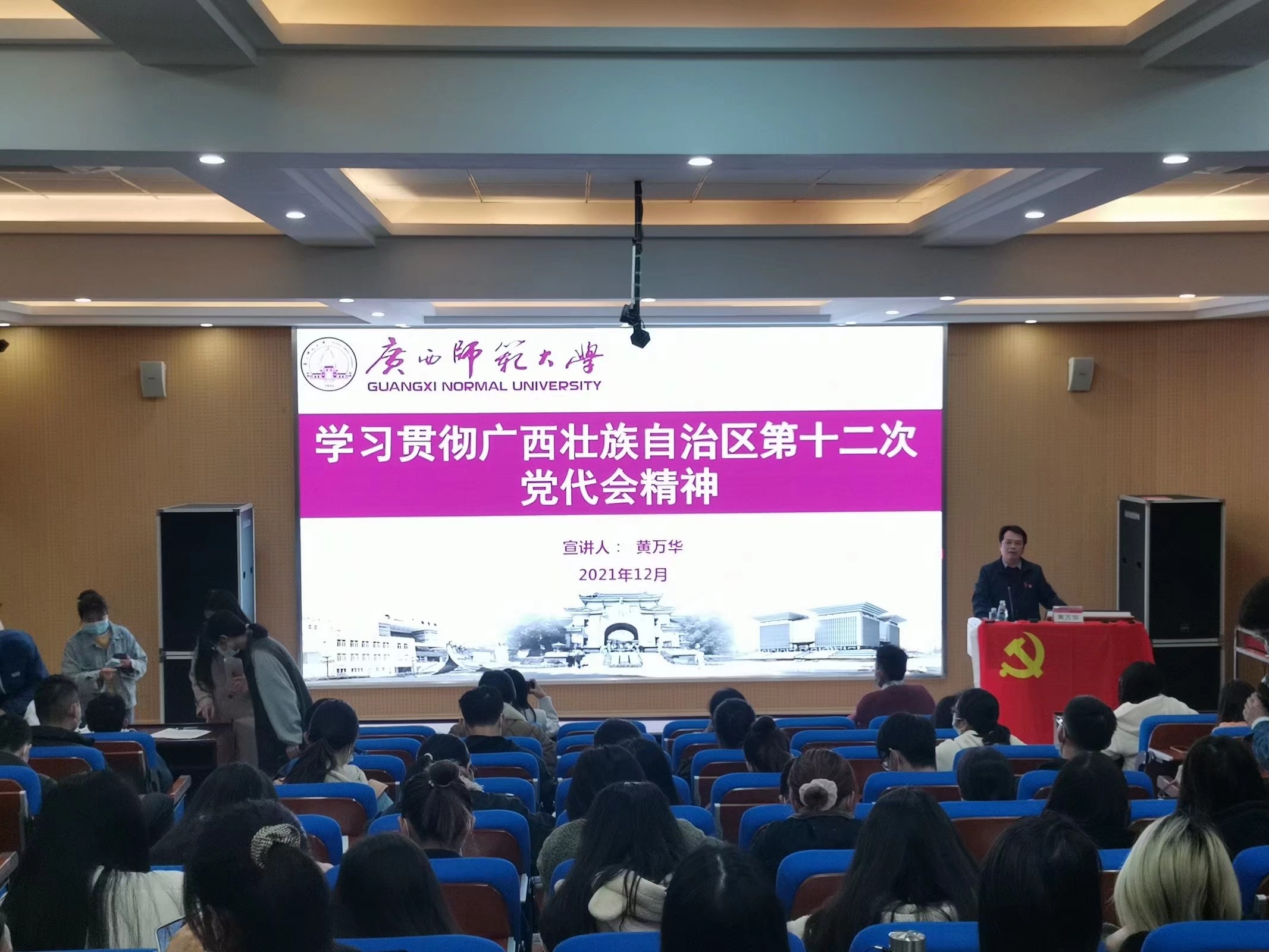 活动现场,黄万华书记在会上就广西壮族自治区第十二次党代会精神作了领学。他先是指出,深入学习宣传贯彻广西壮族自治区第十二次党代会精神,一定要把握广西壮族自治区第十二届党代会的核心内容。为了让同学们更好地理解此次党代会的核心内容,黄万华书记接着对此次党代会的主题做出深刻阐述,并列依次举出大会报告的八大重点,分别做出了详细的论述。