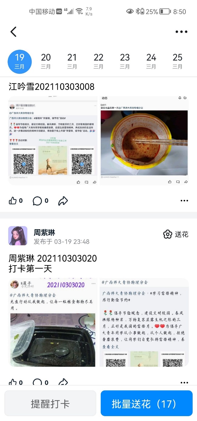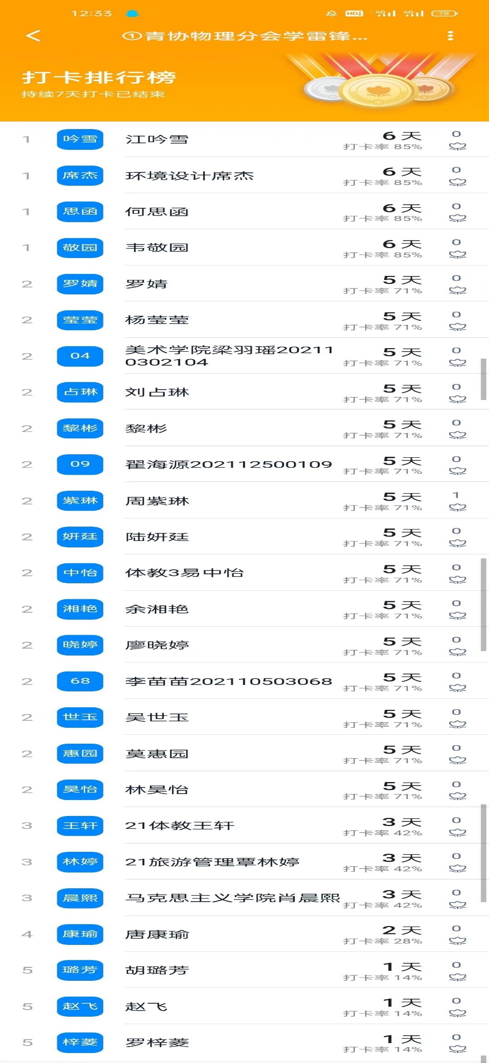 考虑到疫情原因,本次活动采取线上打卡的形式。活动期间,打卡群里工作人员热情回答同学们的问题,同学们有各种不同的节俭方式,比如:光盘行动,随手关水龙头、随手关灯、纸张重复利用等等。为了让同学们相互学习、相互借鉴,形成积极向上的节俭氛围,将打卡内容设置成大家可见的模式。最后,成功打卡的同学获得电子版“坚持之星”奖状。