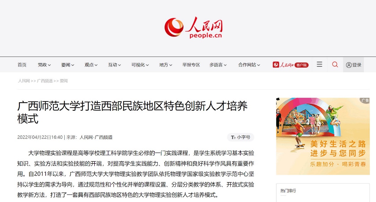 学院新闻2022年4月22日,人民网-广西频道报道我校必一·运动(B-Sports)官方网站与技术学院院长魏代会教授、周厚兵副教授撰写的《广西师范大学打造西部民族地区特色创新人才培养模式》的经验措施推介文章。