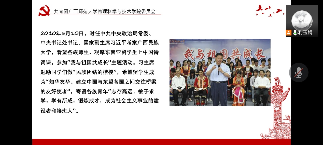 主题学习环节,组织部部长领学了2010年5月10日习近平总书记视察广西民族大学讲话精神。在广西民族大学,习近平看望各族师生,观摩东南亚留学生上中国诗词课,参加“我与祖国共成长”主题活动,并以多民族共学习发展作为切入点,勉励学生们做“民族团结的楷模”,寄语青年们“志存高远,敏于求学,学有所成,锻炼成才,成为社会主义事业的建设者和接班人”。五十六个民族,五十六支花,各民族发展特色的同时团结一心,共进退,作为广西青年,立足自身发展的同时,将奋斗理想与中国梦相结合,提升自我价值。
