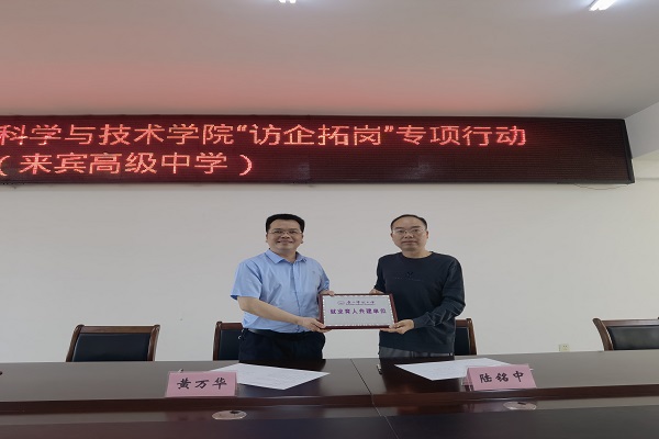 在来宾高中,校长陆铭中对我校的的办学水平和人才培养质量给予充分肯定。双方围绕如何从人才需求实际出发,提升毕业生就业质量,落实立德树人根本任务进行了深入探讨,并就共建师范生教育实习基地、人才招聘等进行了沟通交流,形成了双方要开展多层面交流,拓展毕业生就业渠道、促进人才培养,建立并深化长期、稳定、全面、深度的合作关系,加强教学成果培育、学科培训、课题研究合作等方面的共识。