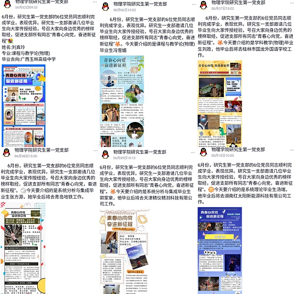 据悉,结合本次党日活动主题,研究生一支部通过支部QQ,以“青春心向党,奋进新征程”为主题,推送6位毕业生研究生阶段的心得和经验,发掘和宣传身边的榜样力量。