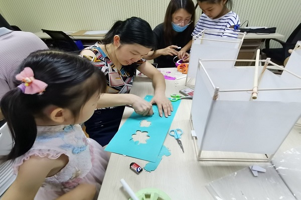 在开始手工制作之前,主讲老师为同学和家长们仔细讲解了制作步骤,并提醒大家在使用工具的过程中要注意安全。同学们在家长和老师们的帮助下,开始制作走马灯。在制作过程中不断发现问题,解决问题,增进亲子间的交流沟通,父母和孩子都获得了满满的成就感。