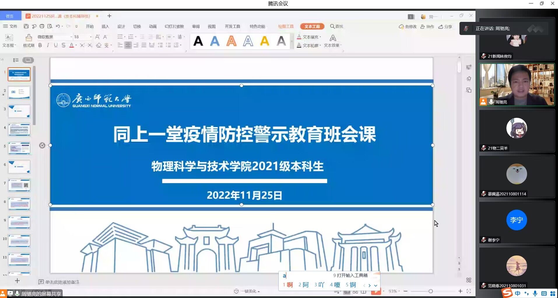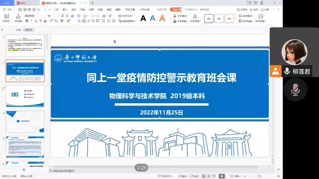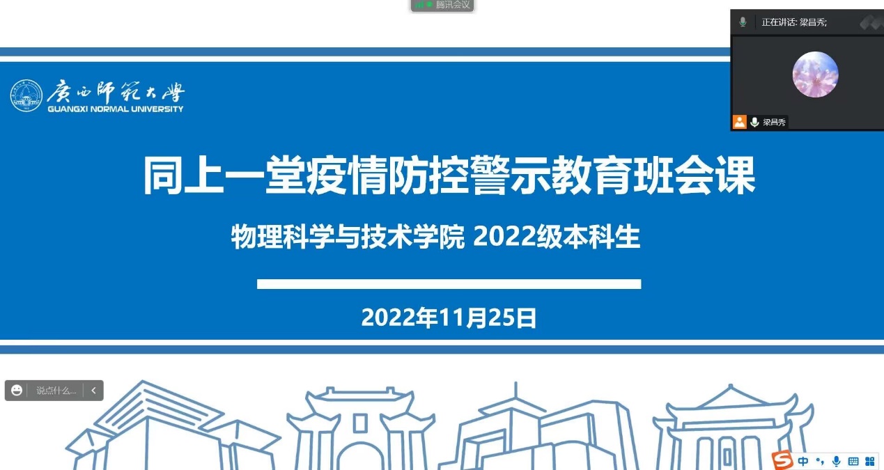 会议伊始,辅导员为大家解读了疫情防控相关政策要求,强调了在疫情发生地区,开展多轮核酸检测的必要性,以及遵守《广西师范大学学生管理规定》等内容。为警示学生做好疫情防控工作,辅导员以多起在疫情防控高峰期,不顾全大局,违反学校防疫规定、私自外出感染新冠、不按规定参加核酸检测、隐瞒行程、伪造防疫码等被处分的典型案例,来警示同学们筑牢防疫屏障,共同守护校园安全。会议最后,辅导员提醒同学们,要戴口罩、勤洗手、不聚集,按时参加核酸检测,坚持每天晨午检,以及不造谣、不传谣、不信谣,严格落实疫情防控相关措施要求。