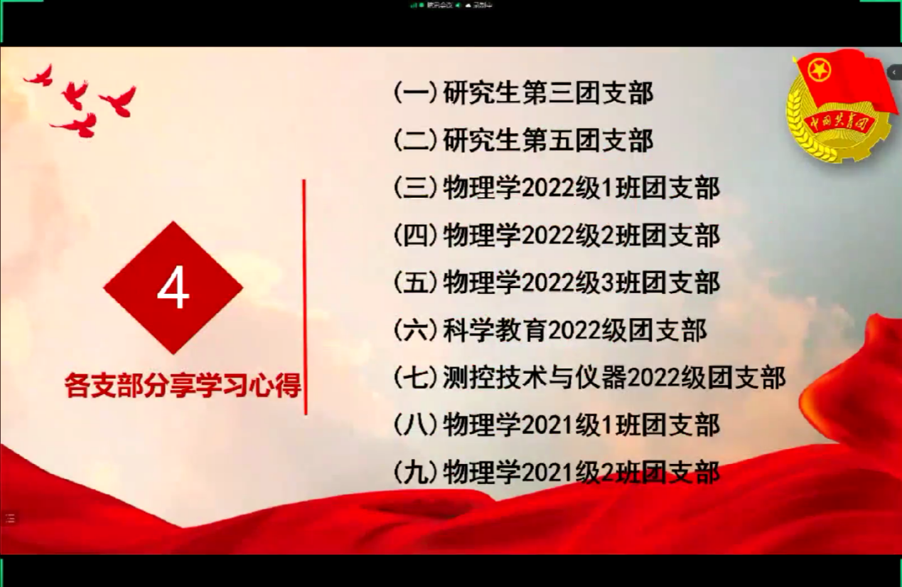 活动伊始,参会人员集体合唱中国共产主义青年团团歌。接着观看了廉洁教育视频,各团支部纷纷表示要围绕青年团支部建设开展工作,做清淳物院学子。学院各团支部通过情景剧、诗朗诵、理论分享等方式分享了学习二十大的心得体会,从二十大报告的新观点、新论断、新思想出发,结合自身的实践和体验,讲述了自己对二十大报告的理解和感悟。