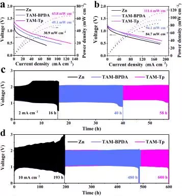 图3. 阳极负载有3D COFs薄膜的锌空气电池性能展示