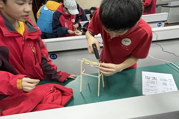 课堂接近尾声时,同学们在助教老师与小伙伴的协同帮助下,完成了属于自己的“投石机“,并向大家展示了自己的作品。最后,主讲老师与助教老师合影留念,”投石机“教学制作课堂顺利结束。