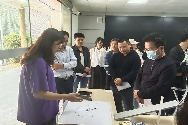 大赛在主持人的简单介绍下开始,评委老师们由学生负责人带领分成两组前往参赛选手区,各组选手向评委老师介绍了自己的参赛作品,详尽说明了其教具的制作原理以及创新理念,认真回答了老师关于教具的提问。评委老师与选手进行探讨并给出了宝贵意见,为教具的创新性与可行性提供更多的思路。其中充满趣味的看见声音装置,巧妙利用声音是物体振动产生的声波的原理,通过对装置收音处进行说话,从而在容器上留下声音的痕迹,同时,评委老师也指出因为容器的材质不够坚固,所以并不能通过留下的痕迹还原声音。还有全反射演示仪,在之前中期汇报的基础上听取了老师的建议,固定了观察的位置,使其现象更加明显,同时改良了加水的方法,利用连通器与针筒,使得整个操作过程简便化,获得了指导老师们的表扬。