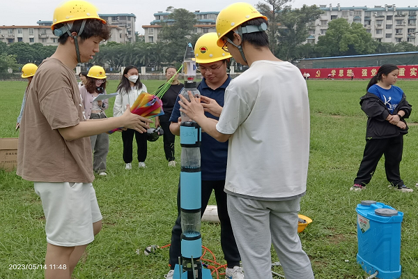 5月14日上午,基础教具制作大赛接近尾声,来到压轴项目——水火箭比高。在制作时,小组内各个成员分工明确,打孔、拼接、剪尾翼......一个个笔直酷炫的水火箭被制作出来。制作完成后,就是测试气密性了,确保气密性没有问题后参赛选手移步大田径场进行发射。发射现场可谓壮观,当水火箭飞上天空之时,几乎在场所有人,以及场外观众纷纷抬头,用目光追随水火箭的轨迹。