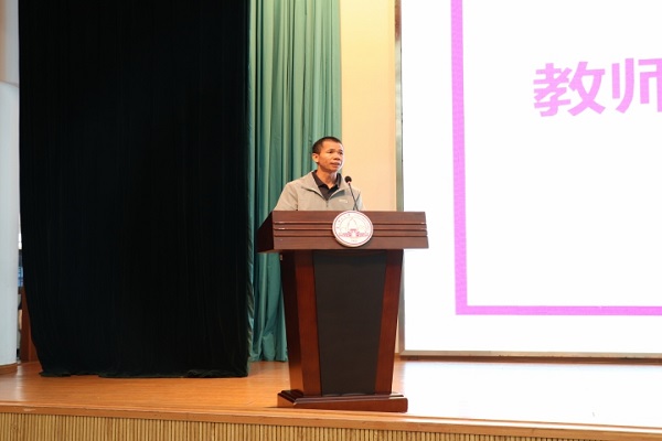 然后,由教师代表高忠贵老师发言。高忠贵老师对同学们给予殷切的期盼,希望同学们在求学过程中要修身立德,厚植家国情怀;问学求知,锻造过硬本领;五育并举,全面健康成长。
