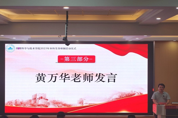 接着,学院党委主要负责人黄万华老师上台发言,他表示导师制为各位学有余力的本科生搭建了高层次交流和发展平台,过去我们的同学在学习过程中存在参与科技学术创新竞赛高水平作品不多、成绩不佳以及本科学生大三下学期末甚至大四才着手本科毕业论文设计工作等问题,从低年级本科生起实行导师制,是一件益事。他表示,希望同学们珍惜导师带领下的严谨的研学环境、上进的求学风气和协作的团队精神,积极主动投身项目研究。他还对积极参与科研导师制的老师们表示了由衷的感谢,并表达了对本科生科研导师制这个平台做出的成绩的殷切期待,希望这个“纽带”将学有余力和对科研有兴趣的本科学生和老师联系起来,同心聚力,共铸辉煌;希望同学们遇到问题经常请教导师,遇到科研兴趣多向导师汇报,遇到比赛多向导师咨询,遇到学习困境也可以多向导师请教。此番发言也给在座的同学们带来格物致知路上的启迪与思考。
