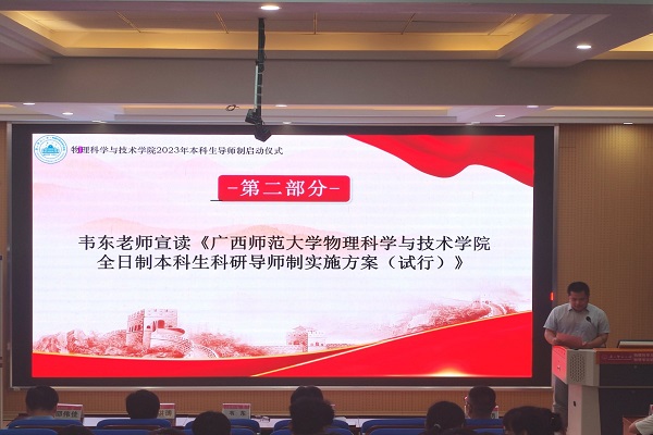 接下来,党委相关负责人韦东老师向在座各位导师代表和入选同学宣读了《必一·运动(B-Sports)官方网站全日制本科生科研导师制实施方案(试行)》,并表示学院从2018年开始实行本科生科研导师制,采用“双轮”“双驱”“双主体联动”的新型本科生导师制培养模式,在本科生中试行科研导师制,是通过学术科研项目这一纽带,充分利用教师的科研能力,让学有余力和对科研有兴趣的本科学生参与导师的课题研究,形成导师指导下,研究生-高年级本科生-低年级本科生的学术交流梯队。学院三分之一的老师申请成为本科生的科研导师,不胜枚举的本科生积极报名参与了导师制。韦东老师还表示,本科生科研导师制历年来一直不断改进润色,不断地为学院治学风气做贡献,这期间始终保持着斐然的成效,推动着全院学生热情高涨地参与学术研究,氛围浓郁。