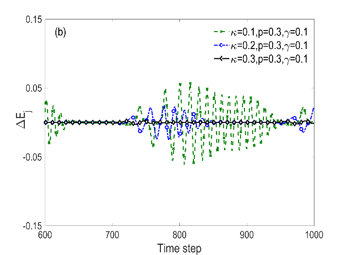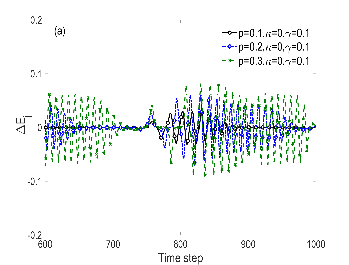 图5表示DAIE模型中能耗演化。能耗的波动幅度随着值的增大而增大,由此得出DAIE会增加车辆在换道时的能耗。随着值的增加,能耗波动振幅减小。因此,尽管DAIE加剧了换道过程的不稳定性和能源消耗,但模拟结果证明,DAE可以有效抵抗DAIE的负面影响。