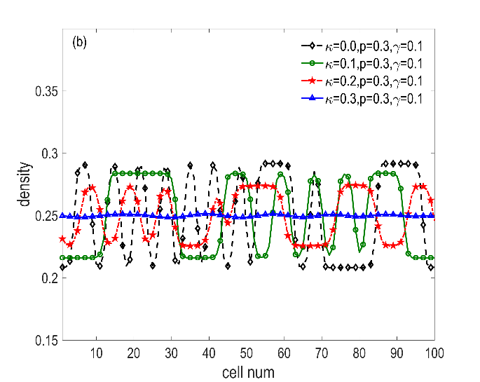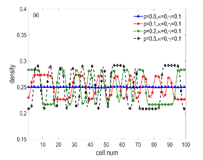 密度演化数值模拟结果如图3所示。密度分布波动幅度随值的增大而增大,随着值的上升,密度分布波动幅度逐渐减小。在DAIE模型中,DAIE虚假攻击会恶化换道过程,最终导致交通系统的混乱。而补偿算法DAE可以有效地缓解由于DAIE导致的交通系统的无序性,即DAE能够抵消换道过程中的不良影响。
