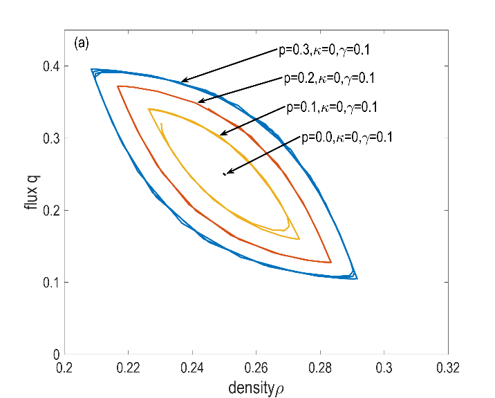 图4表示DAIE模型的迟滞环。显然,迟滞环的面积随p值的增大而增大,说明DAIE会干扰换道过程中交通稳定的情况。迟滞环的面积随着值的增大,迟滞环的面积逐渐缩小,说明DAE可以缓解虚假攻击对交通稳定性的负面影响。