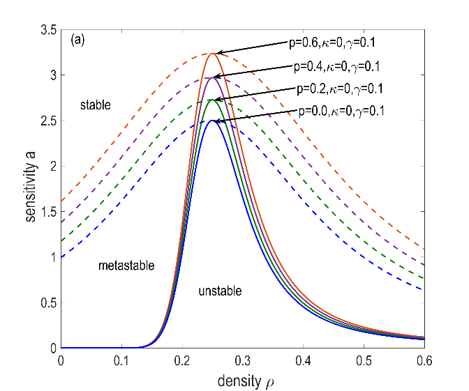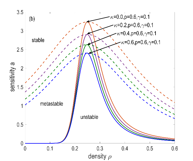 线性稳定性和非线性分析结果如图2所示。随着值的增大,中性曲线和共存曲线都随着值的增大而上升,系统的稳定区域减小,表明虚假攻击会降低系统的稳定性。但随着值的增加,中性曲线和共存曲线下降,系统的稳定区域扩大,表明DAE能够抵抗虚假攻击的影响。因此,在V2X环境下,在换道过程中虚假的流入换道率攻击会降低系统的稳定性。相反,DAE可以有效地减轻虚假攻击的负面影响。