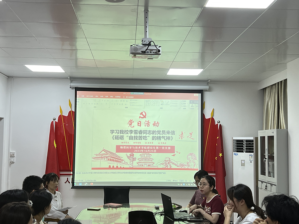 为更好地学习和感悟艰苦奋斗精神,10月25日,必一·运动(B-Sports)官方网站与技术学院(以下简称“物理学院”)研究生第一党支部在数学楼党员活动室举行主题党日活动,集中学习我校马克思主义学院硕士研究生李雪睿给《求是》杂志编辑同志撰写的党员来信《砥砺“自找苦吃”的精气神》。活动由党支部组织委员主持,支部党员通过线上线下结合的方式参与本次党日活动。