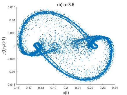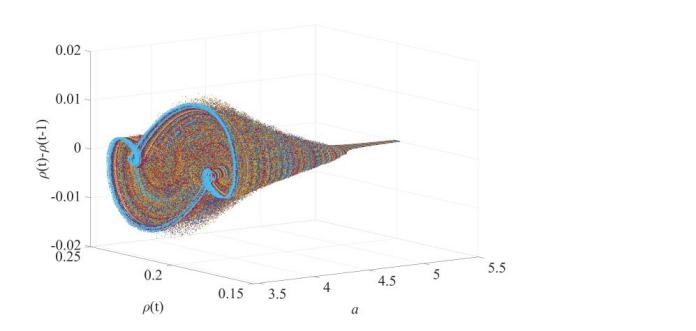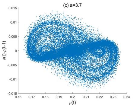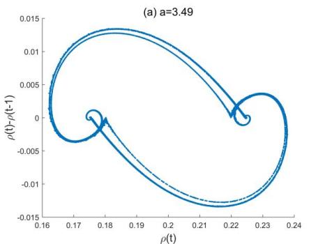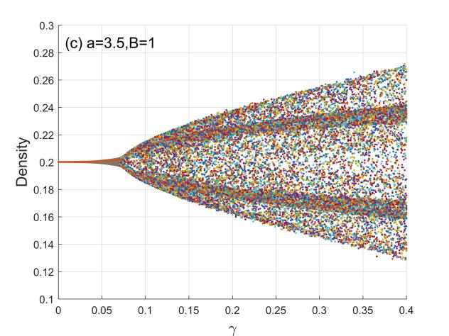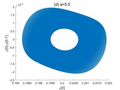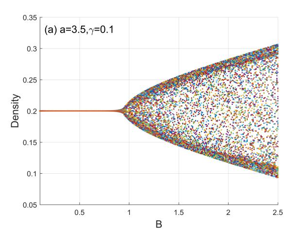 图3进一步说明演化过程,随着a值的增加,路径曲线的波动范围减小,交通稳定性和可预测性增加。在扭结堵塞区域,路径曲线是稳定极限环。对于混沌阻塞区域,在极限环的周围和内部会出现许多散点。随后路径曲线的密度差在小范围内略有波动,交通流趋于稳定的自由流。