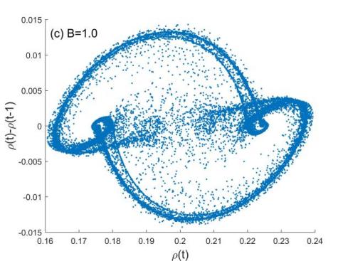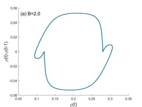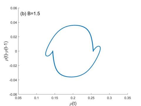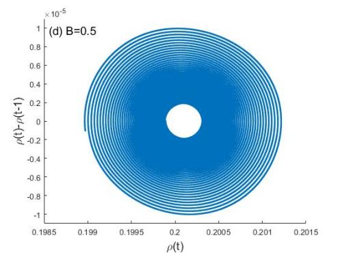 图1(a)和图1(b)中的稳定闭合路径曲线显示了稳定周期性扭结堵塞情况的极限环。图1(b)中的极限环的波动范围比图1(a)中的波动范围小,这意味着交通流的稳定性在扭结堵塞区域随着B值的减小而上升。图1(c)表示B=1时具有稳定的闭合路径曲线和不规则的散射点,分别对应于稳定扭结阻塞和不规则混沌阻塞的情况。然而,不存在闭合路径曲线,且轨迹通过在图中顺时针旋转而趋向于平衡点(0.2,0)。图1(d)段表示没有堵塞的情况。显然,图1(d)显示几乎没有密度波动。此外,从图1中可以看出,其波动范围随着B值的减小而变小。异质交通流系统的密度波动范围逐渐减小,在, 和 减小的情况下,稳定性和通行效率呈增加趋势。