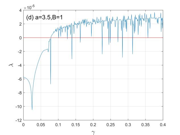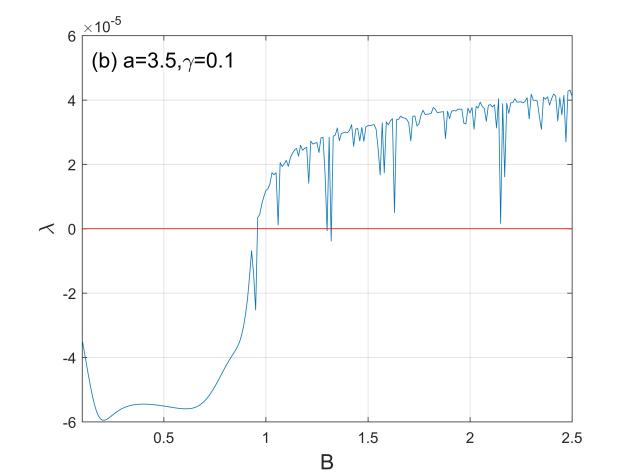 图4是根据李雅普诺夫指数得到的分岔图。如图4(a)和(b)所示,李雅普诺夫指数小于零时所有格点的密度随着B值的增加而基本相同。当李雅普诺夫指数等于零时,发生密度分岔。当李雅普诺夫指数大于零,图中所有格点位置的密度分岔范围随B值放大而放大。密度散射主要集中在分岔范围的顶部和底部。在中间分岔范围内,密度散射较薄。总之,混沌的发散度随着分岔区 B值的增加而变宽。从图4(c)和(d)得知,李雅普诺夫指数小于零时,随着超车系数的增加而基本相同,所有格点的密度分叉范围都很小。当李雅普诺夫指数等于零时,密度分叉开始出现,密度分岔范围随着超车系数的增加而扩大。此外,密度散射主要分布在更接近中间范围的密度分叉范围,并且在两侧密度分叉范围内更稀疏。总之,在分岔区,由超车效应引起的混沌现象更加复杂。一般来说,模拟结果与关于系统稳定性与参数之间关系的理论分析结果一致。