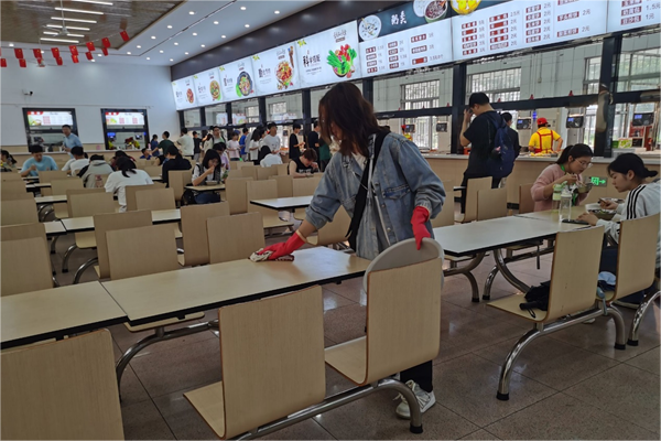 志愿者们深入体验基层工作,为食堂工作人员减负,始终保持着认真负责的工作态度。志愿服务过程中,组织有序,分配合理,小组长们带领志愿者们在相应活动区域开展清洁工作。志愿者们或是收拾桌面食物残渣,或是擦拭干净餐桌桌面,始终热情饱满,不马虎不敷衍,充分发扬了干一行爱一行的敬业精神和乐于奉献精神。