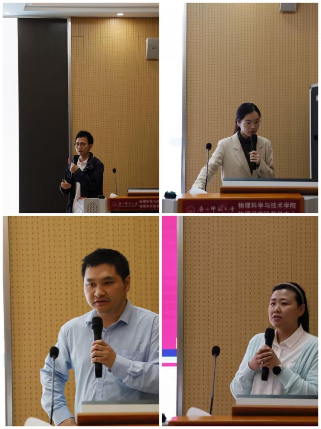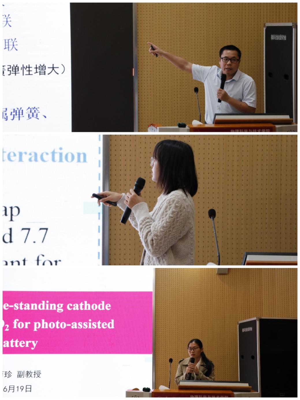 论坛过程中,陈海深老师基于项目式学习的理念,作了有关提高物理实验教学效果的报告;陈倩老师作了主题为“高温高密QCD物质中守恒荷涨落性质的研究”的报告;龙丽珍老师报导了将半导体光催化技术与锂-二氧化碳电池相融合以提高电池循环稳定性的相关理论研究;黎远鹏老师汇报了近红外水光谱组学(Aquaphotomics)原理及其在生物医学领域的应用研究进展;莫玉香老师作了以“全长hIAPP三聚体自组装的分子机制:β-纤维前体由β-发夹在横向或纵向上结合形成”为主题的研究报告;邵伟佳老师从三个方面介绍了热电子光电转换领域的进展;张欣蕊老师在报告中介绍了多核子转移反应对Z = 62-75及Lr丰中子核素的产生,预言了新核素的产生截面、最佳入射能量及产生率等信息。