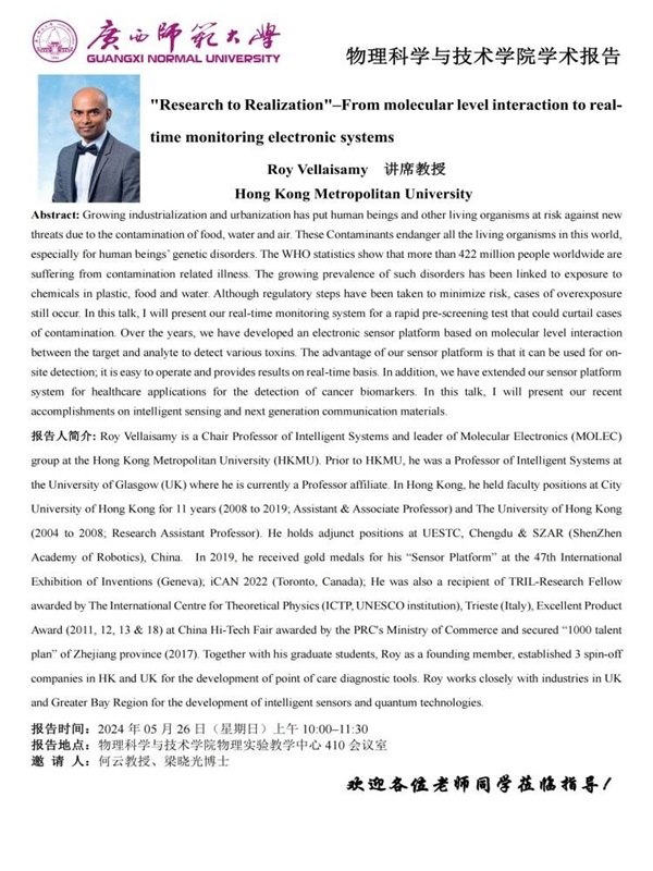 学术报告:"Research to Realization"–From molecular level interaction to realtime monitoring electronic systems
