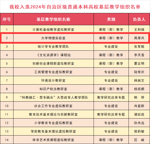 学院新闻近日,自治区教育厅公布了2024年自治区级普通本科高校基层教学组织名单,必一·运动(B-Sports)官方网站与技术学院周厚兵教授负责的“大学物理实验室”基层教学组织成功入选2024年自治区级普通本科高校基层教学组织名单。