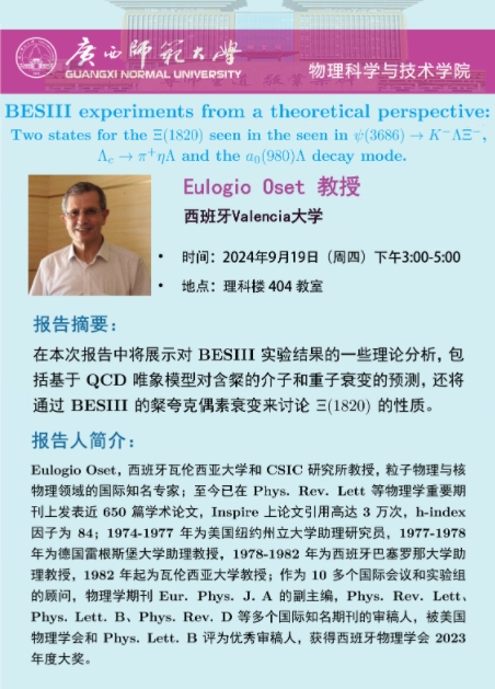 【学术预告】Eulogio Oset :BESIII experiments from a theoretical perspective: Two states for the Xi(1820) seen in the seen in ψ(3686) -> K^−Λ \barΞ^+. Lambda_c -> pi+ eta Lambda and the a0(980) Lambda decay mode