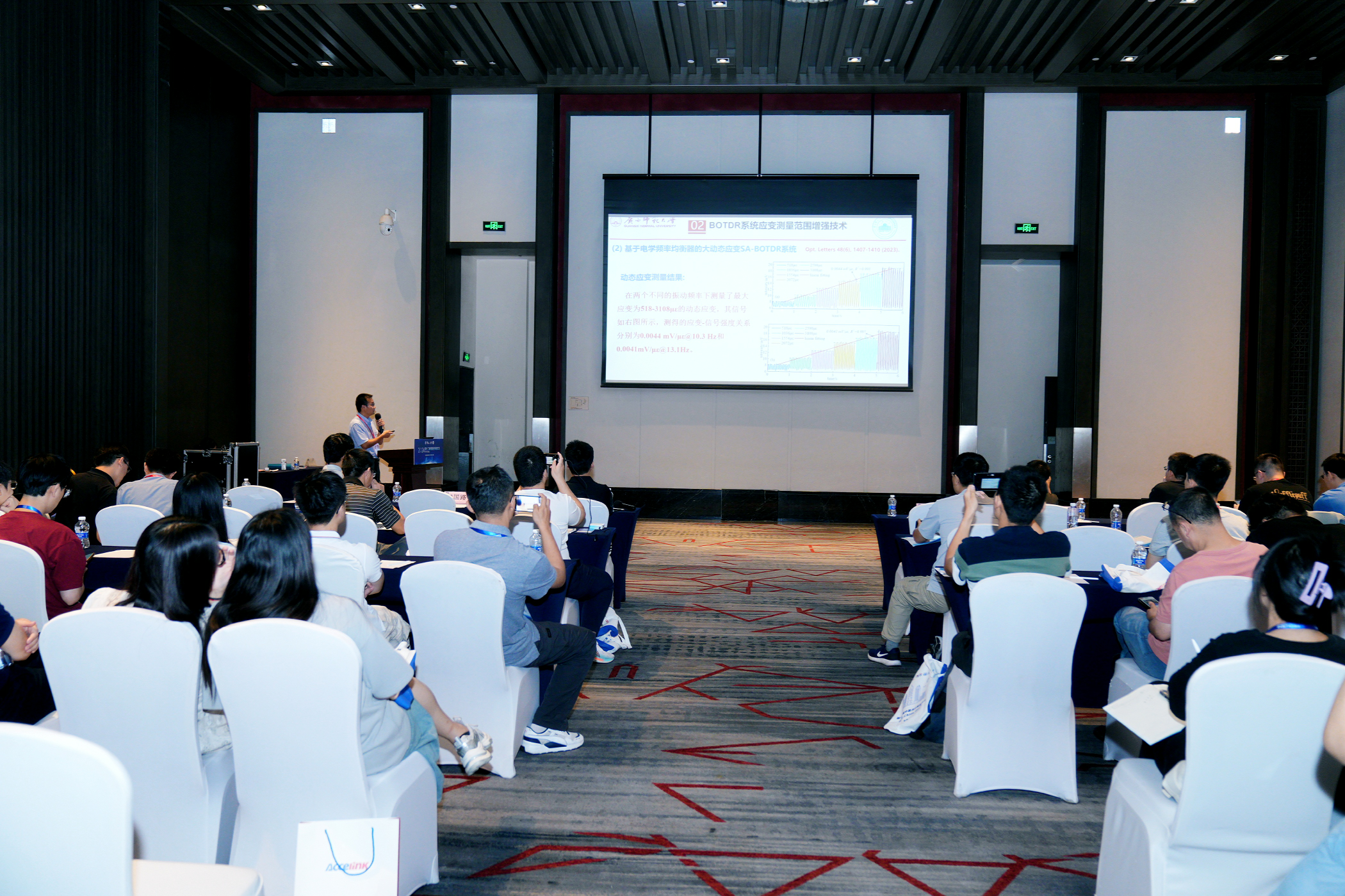 我院胡君辉教授受邀在光纤分布式传感器专题会场作了题为《分布式光纤传感应变测量范围增强技术》的主旨报告。胡君辉教授提出,分布式光纤传感技术具有通感一体、连续分布、超长距离、可嵌入、抗电磁干扰、耐腐蚀等诸多优点,是大型基础设施结构健康监测的最佳候选技术之一。在报告中,针对斜坡辅助布里渊光时域反射仪(SA-BOTDR)和光频域反射计(OFDR)存在应变测量范围受限的问题,提出相应的应变测量范围增强技术,为大应变测量工程应用提供了新的技术解决方案。