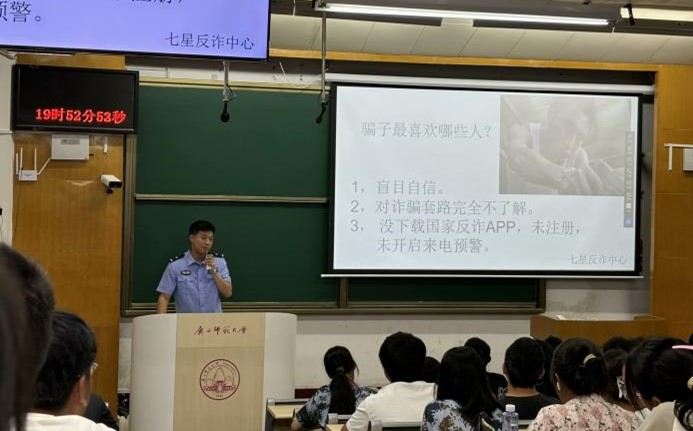 9月12日晚,为增强学生的反诈骗意识,学院特别邀请了桂林市公安局七星分局七里店派出所在数学楼201教室开展反诈骗宣传讲座。讲座中,派出所民警结合当前多发的、形式多样的诈骗案件,深入剖析了层出不穷的诈骗手段,为在场的学生普及了大量实用的防诈骗知识,有效提升了学生的安全防范意识。