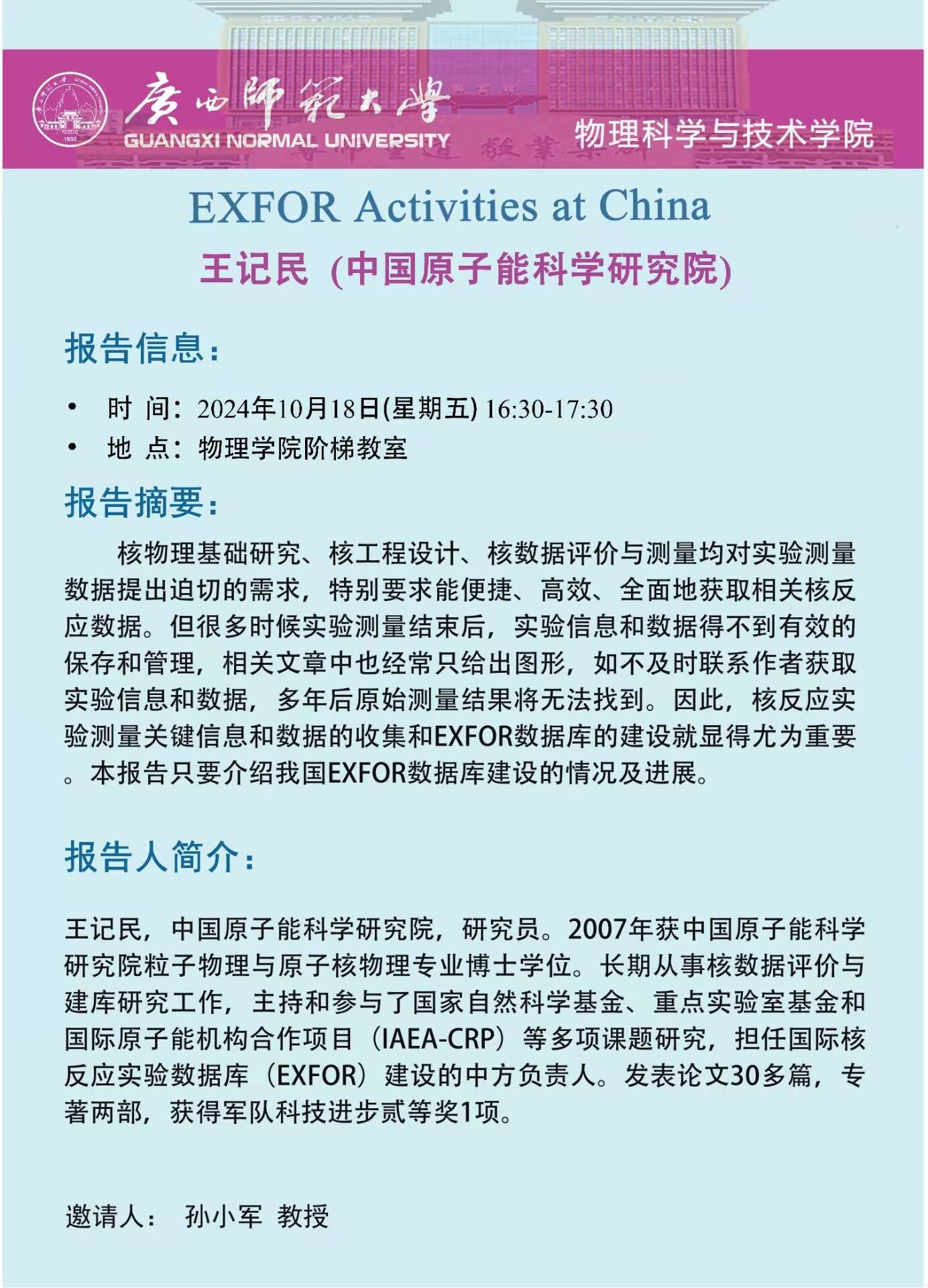 【学术预告】王记民(中国原子能科学研究院):EXFOR Activities at China