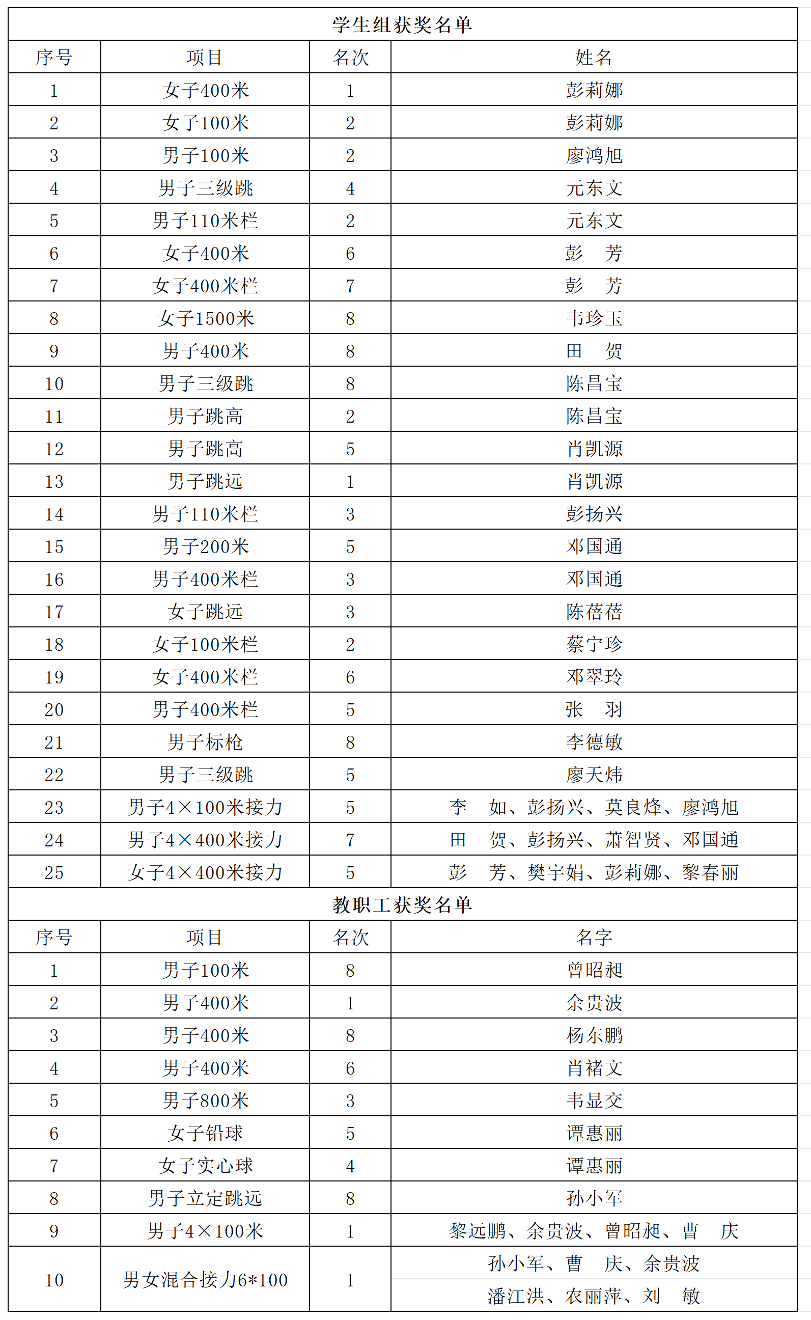 学院师生校运会获奖名单