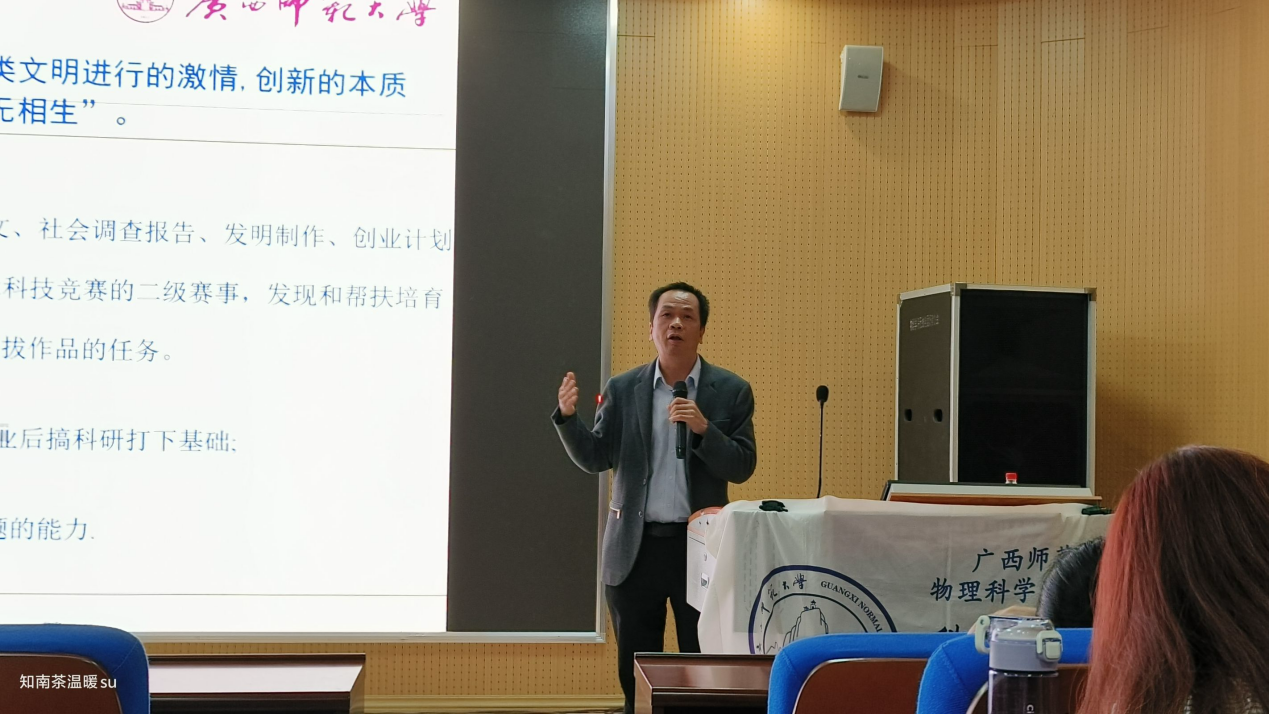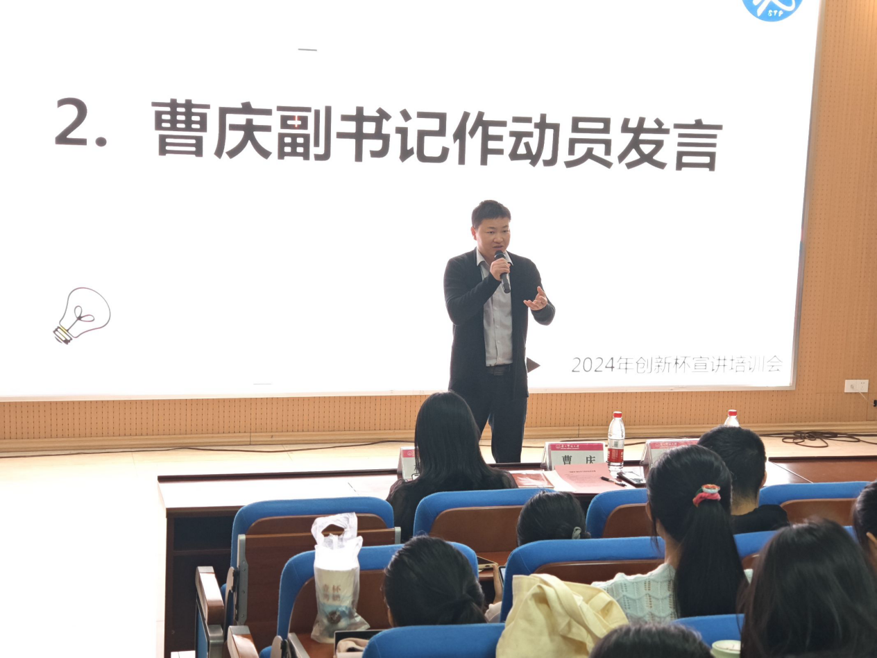 会上,党委相关负责人曹庆老师作动员发言。他详细讲述了自身参加“创新杯”的亲身经历,指出创新类赛事是激发同学们创新思维、提升创新能力和实践能力的重要平台。他希望在座同学能够把握机会,积极踊跃组队参赛,勇于做问题的发现者,自觉做到研究项目与服务社会相联系,不断培养自身发现问题、解决问题的能力,充分展现物院学子积极向上的精神风貌。