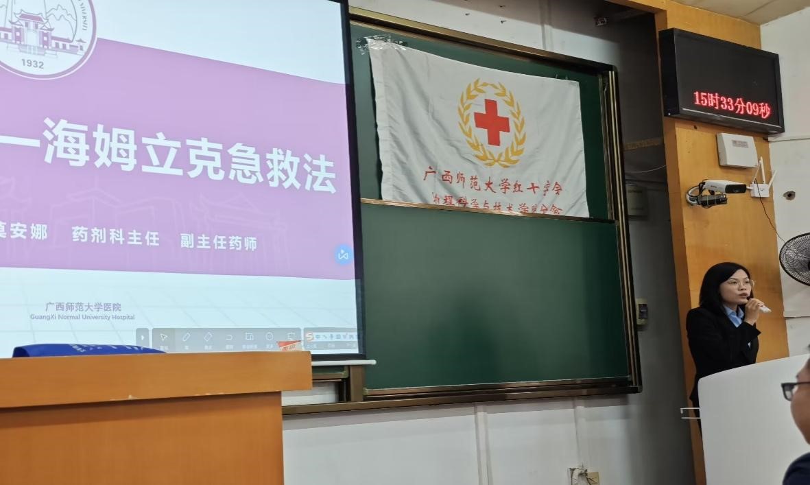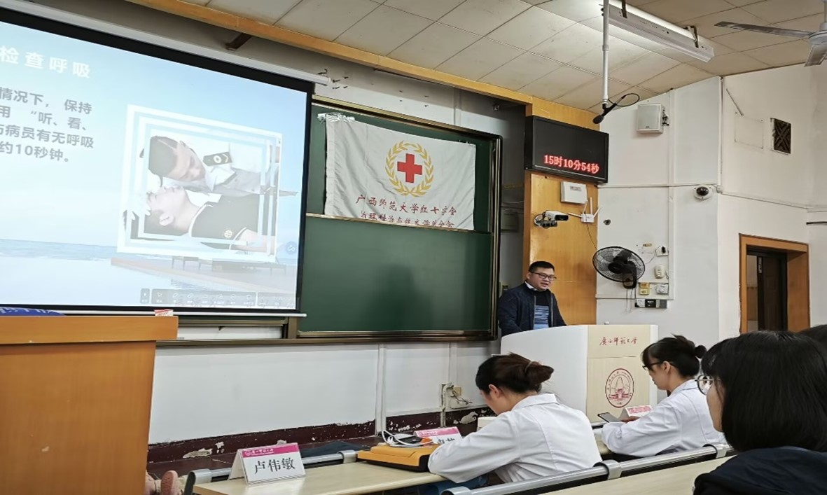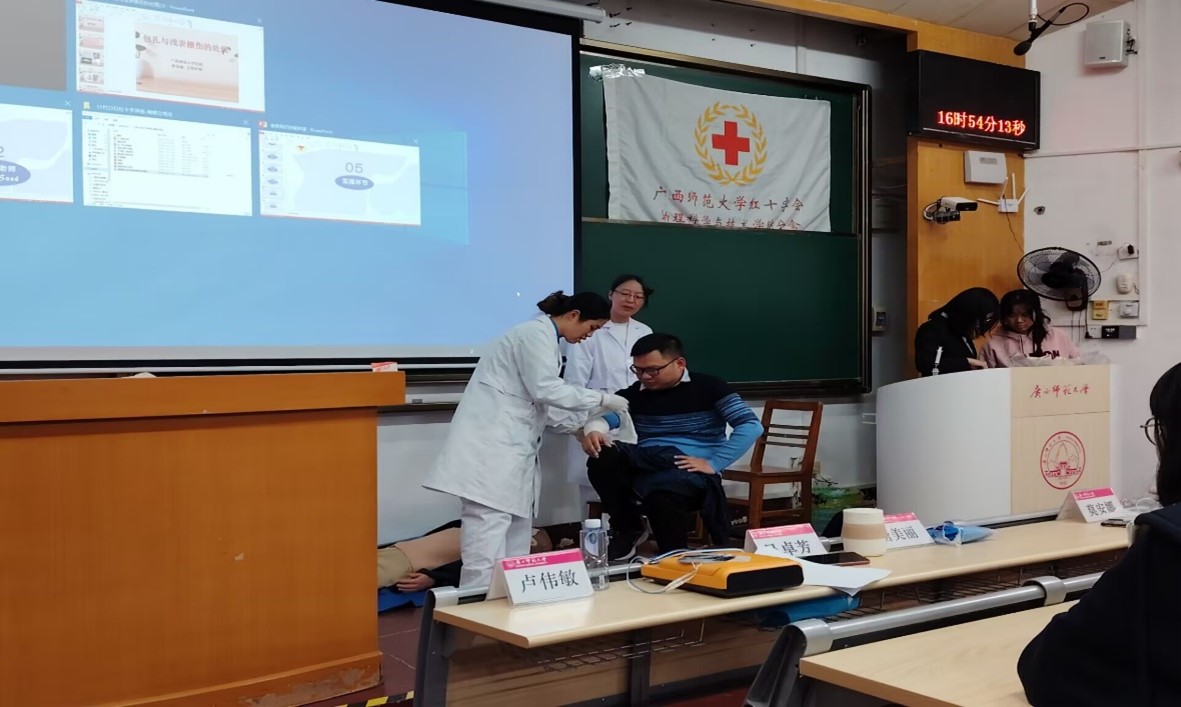 讲座伊始,校医院卢伟敏老师为同学们讲解了心肺复苏AED(自动体外除颤仪)的操作流程,从判断患者意识、呼吸,到胸外按压的位置、频率、深度,再到人工呼吸的正确方式,每一个环节都讲解得清晰透彻,同时,配合人体模型进行现场演示,生动地展示了整个急救流程。莫安娜老师向同学们演示海姆立克急救法,她利用模型,分别解释了一岁以下婴儿、未成年人和成人的急救方式,强调具体的注意事项,同学们受益匪浅。唐美丽老师通过生动的案例和图片展示详细演示院前伤口简易包扎的相关知识,让同学们更加直观地了解伤口简易包扎的过程。